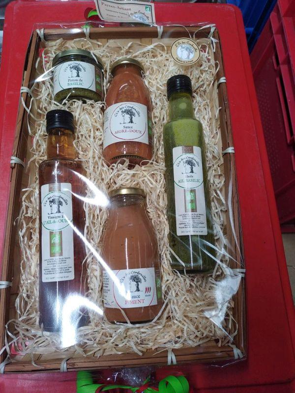 Jolie panière en bois de bambou comprenant: 1 Pistou de Basilic, 1 Sauce Aigre-Doux, 1 sauce piment, 1 Vinaigre à l'Ail des Ours, 1 Huile Ail et Basilic.